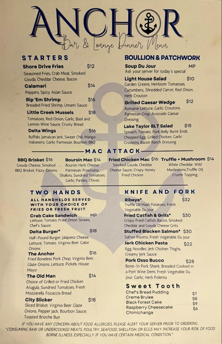 Anchor Bar & Lounge Restaurant Menu brings a relaxed, come-as-you-are vibe to the Delta by Marriott near the Norfolk Airport, and the food fits the mood perfectly. Tucked inside the hotel on N Military Hwy, it’s the kind of spot where you can settle in after a long flight and immediately feel like you’ve made a good choice. The menu leans into familiar comfort favorites, yet each dish has a little something extra that makes it memorable.
